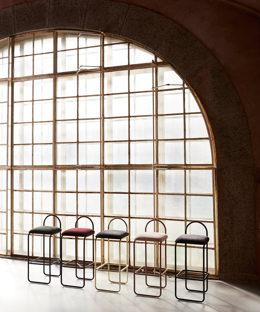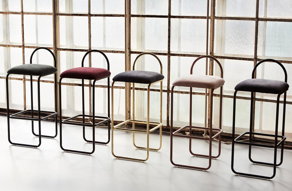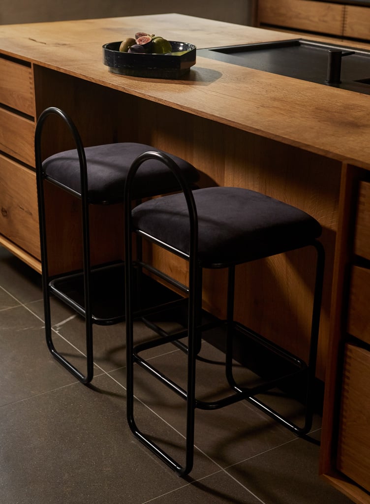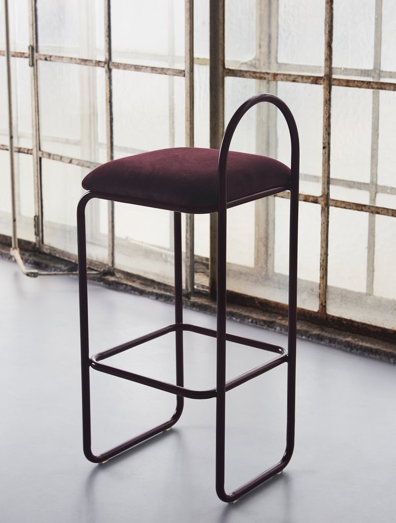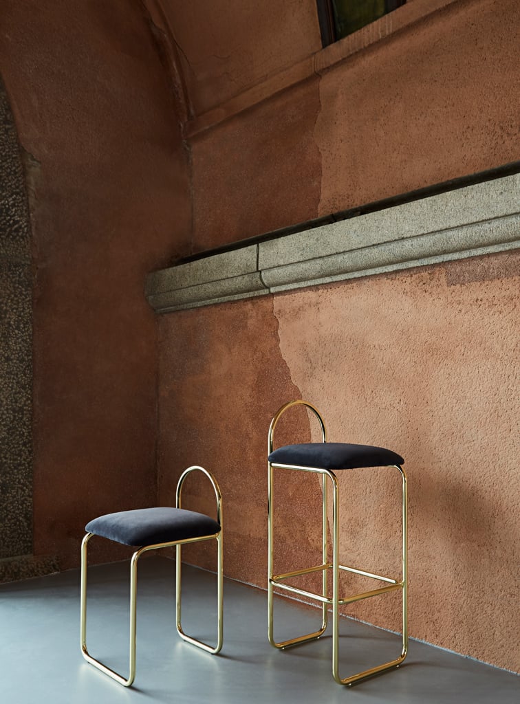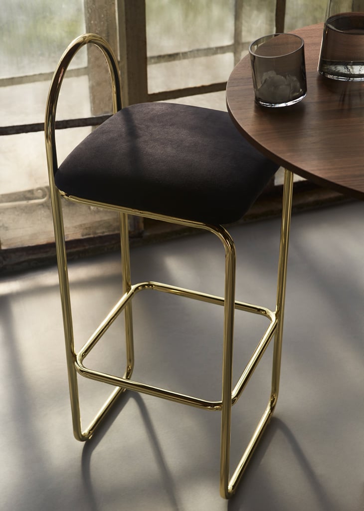 Das elegant geschwungene Eisengestell des Angui Barhockers sorgt für Stabilität und wird von einem weich gepolsterten Bezug aus feinem Samt ergänzt, das mit seinem warmen Schimmer zum Sitzen und Verweilen einlädt. Skulptural, schlicht und dennoch luxuriös, fügt sich der Angui Barhocker von AYTM mühelos in jedes Ambiente ein und schenkt jedem Interieur eine ganz besonders edle Note.