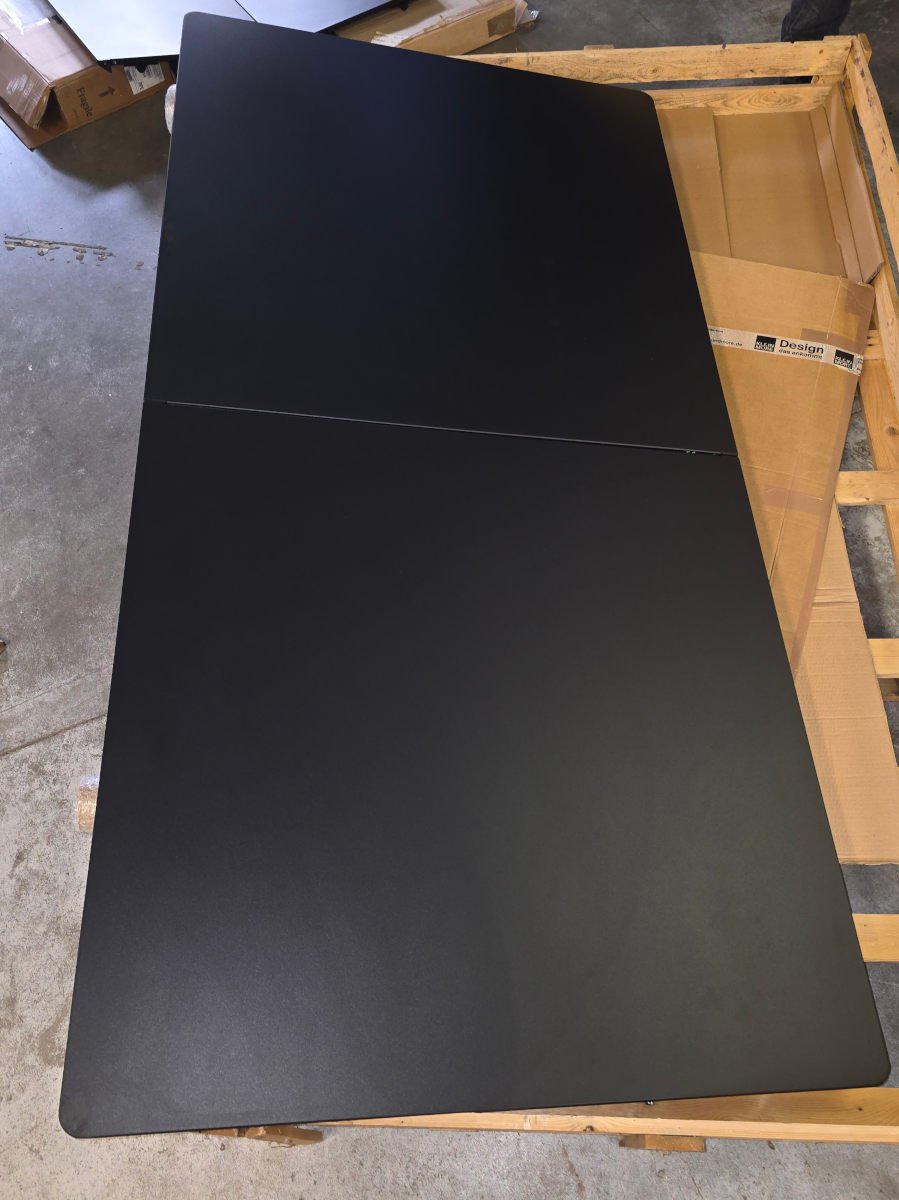 Die Tischplatte ist aus hochwertigem pressgebogenem Metall gefertigt und wird mit besonderer Sorgfalt bearbeitet, um ein ästhetisch ansprechendes Ergebnis zu erzielen. Das Design der Schienen zum Ausziehen der Tischplatte wurde speziell von emu geschaffen und ermöglicht einen schnellen und einfachen Umbau des Tisches. Der Butterfly-Auszug der im Inneren des Tisches verstauten Verlängerung macht es möglich, die Länge des Tisches zu reduzieren, wenn weniger Platz benötigt wird.