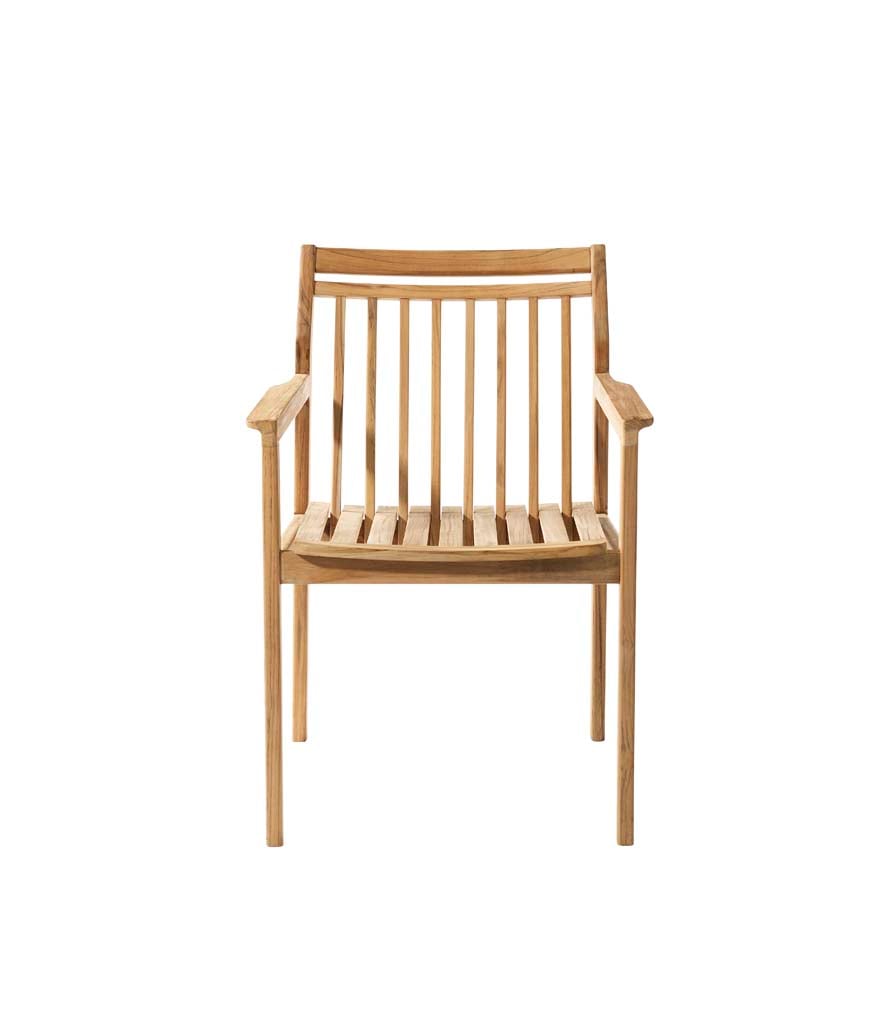 Aufgebaut ist der FDB Møbler M1 Sammen Outdoor Stuhl als ein normaler Esszimmerstuhl, den man Zuhause benutzt: Ein stabiles Gestell mit weiten Sitz und Rückenlehne sowie Armlehnen für einen zusätzlichen Komfort. Die Idee des Designers beim Schaffen der Sammen-Kollektion war, dass man sich in diesem Möbel wie zuhause fühlen soll – und das ist ihm gut gelungen, da die Sammen-Möbelstücke ein sehr heimeliges Gefühl aufwecken. Dies ist vor allem durch die Material- und Farbwahl möglich. Der FDB Møbler M1 Sammen Outdoor Stuhl ist aus Massivholz angefertigt und ist in einem hellen, angenehmen Farbton dargestellt, sodass er zugleich unkompliziert und stilvoll aussieht. Das verwendete Holz eignet sich für Outdoor-Bereiche, wie etwa Gärten, und hat eine FSC-Zertifizierung, was für Nachhaltigkeit steht.