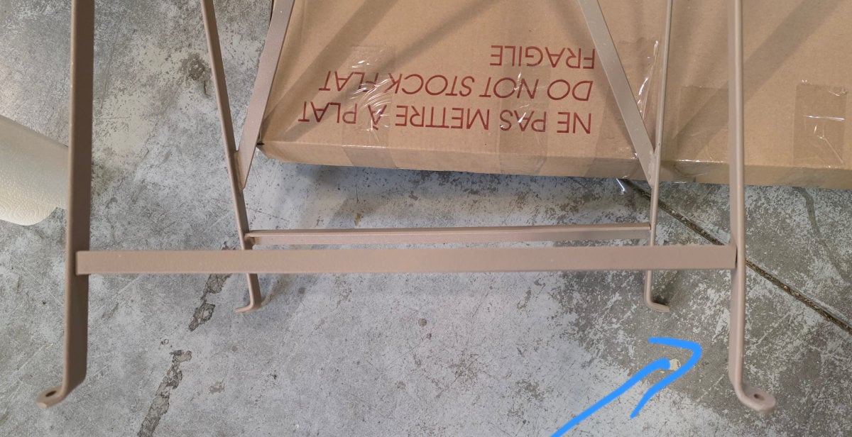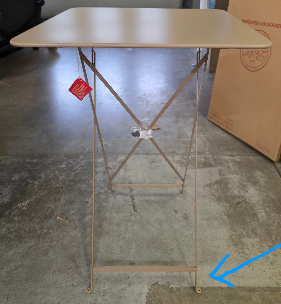 Bitte beachten Sie: Sie erhalten hier ein Ausstellungsstück mit einem etwas verbogenen Fuß und ein paar mit Original-Fermob-Lack ausgebesserten Stellen, welches etwas wackelt - bitte siehe Bilder - aus unserer Ausstellung zu einem besonders attraktiven Preis!