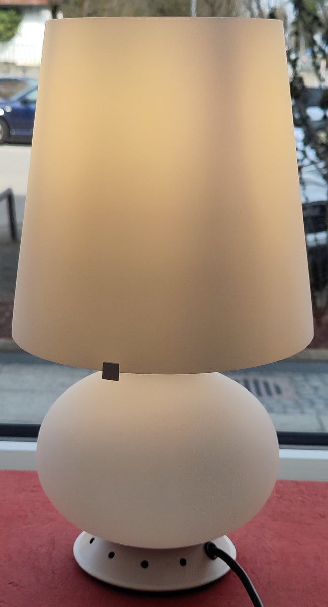 Sie erhalten die Fontana Arte Fontana 1853 Tischleuchte in drei verschiedenen Größen: piccola, media oder grande. Die kleine und die mittlere Leuchte verfügen über je ein Leuchtmittel im Leuchtenkopf und zwei im bauchigen Fuß. Die größte Version der Fontana 1853 Tischleuchte hingegen hat sogar sieben Lichtquellen und bietet zusätzlich nach oben gerichtetes Licht. Egal wieviele Lichtquellen auch vorhanden sind - sie sind immer getrennt voneinader an- und ausschaltbar über den Dreifachschalter am schwarzen Kabel.