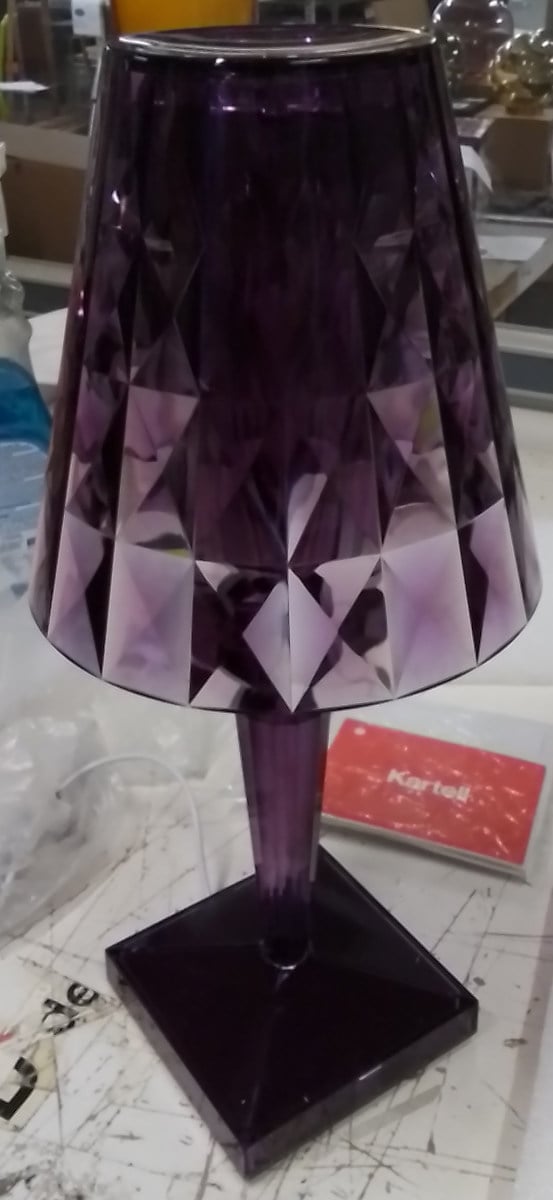 Die Kartell Big Battery Tischleuchte mit Kabel ist eine schillernde Lichtquelle von Ferruccio Laviani. Der kunstvoll geschliffene Leuchtenschirm funkelt bei eingeschaltetem Licht wie ein kostbares Juwel.