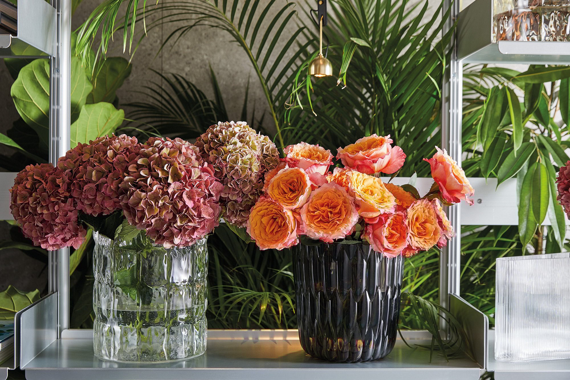 Das Spannende an dieser Serie ist ihre Gegensätzlichkeit: der solide, haltbare Kunststoff steht in auffälligem Kontrast zum geleeartigen Erscheinungsbild der Oberfläche. Das Spiel mit der Optik von süßem Gelee zieht sich auch bis in die Farbgebung hinein, so gibt es die Kartell Jelly Vase in vielen bunten Farben, in transparenten, blickdichten und in drei metallisierten Ausführungen, die wunderschöne Arrangements ergeben.