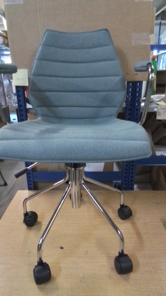 Der Kartell Maui Soft wird aus strapazierfähigem Nylon gefertigt und verfügt über ein Gestell aus verchromtem Stahl. Mit Hilfe der Gasfeder ist der Stuhl in der Höhe um bis zu 8 cm verstellbar. Im Gegensatz zur ursprünglichen Maui-Version besitzt der Kartell Maui Soft Bürostuhl eine Sitzschale mit einem ansprechenden Stoffbezug. Dieser Trevira-Stoff steht in 6 unterschiedlichen Farben zur Auswahl. Zusätzlich zu dieser Version mit Armlehnen und Gasfeder bietet Kartell auch Varianten ohne Rollen und ohne Armlehnen an.
