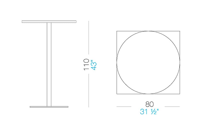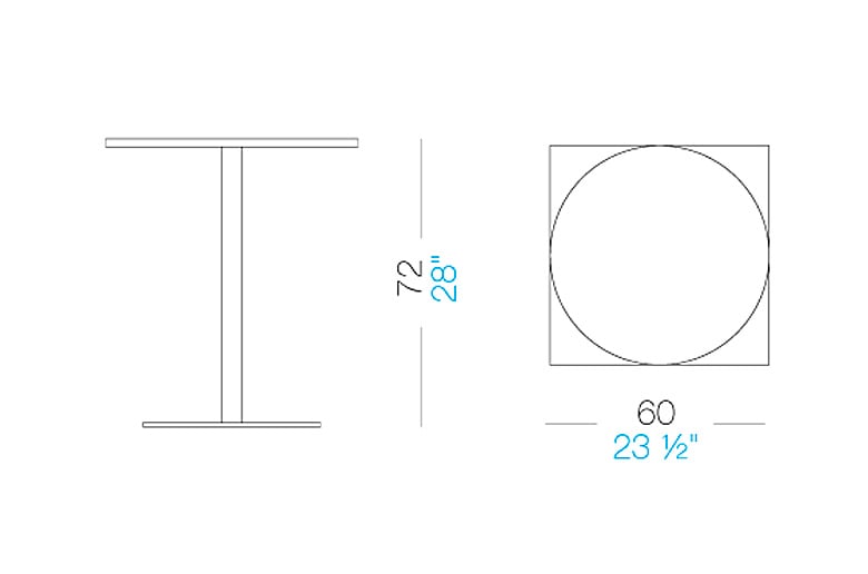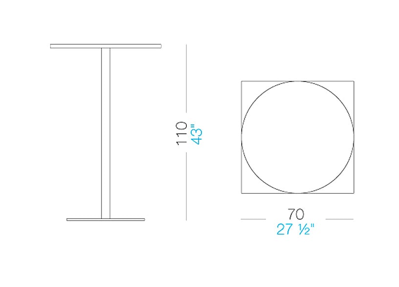 | Maße: | H 72cm / H 110cm Ø Tischplatte 60cm; Ø Bodenplatte: 46cm |