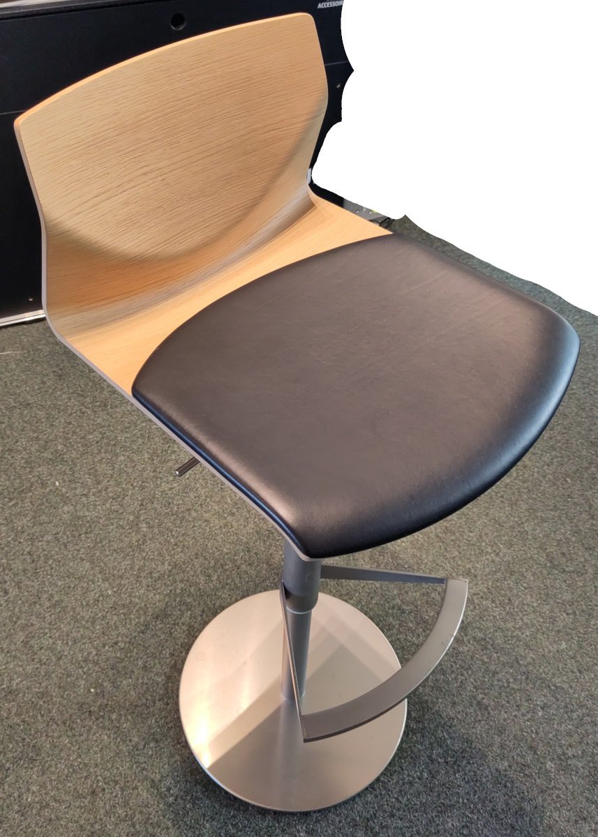 Die leicht gebogene Sitzschale wird aus Multiplex hergestellt und ist in gebeizten, lackierten und gebleichten Holzvarianten sowie in verschiedenen Lederbezügen erhältlich. Der drehbare Lapalma Kai S39 Barhocker ist mittels einer Gasdruckfeder in der Höhe stufenlos zwischen 54 cm und 79 cm verstellen und so Ihren individuellen Ansprüchen anpassen. Für genügend Stabilität und Standsicherheit sorgen das Gestell aus Edelstahl und der metallene Fuß. Dieser ist in der Variante Edelstahl mit einer Leinenstruktur versehen ist.