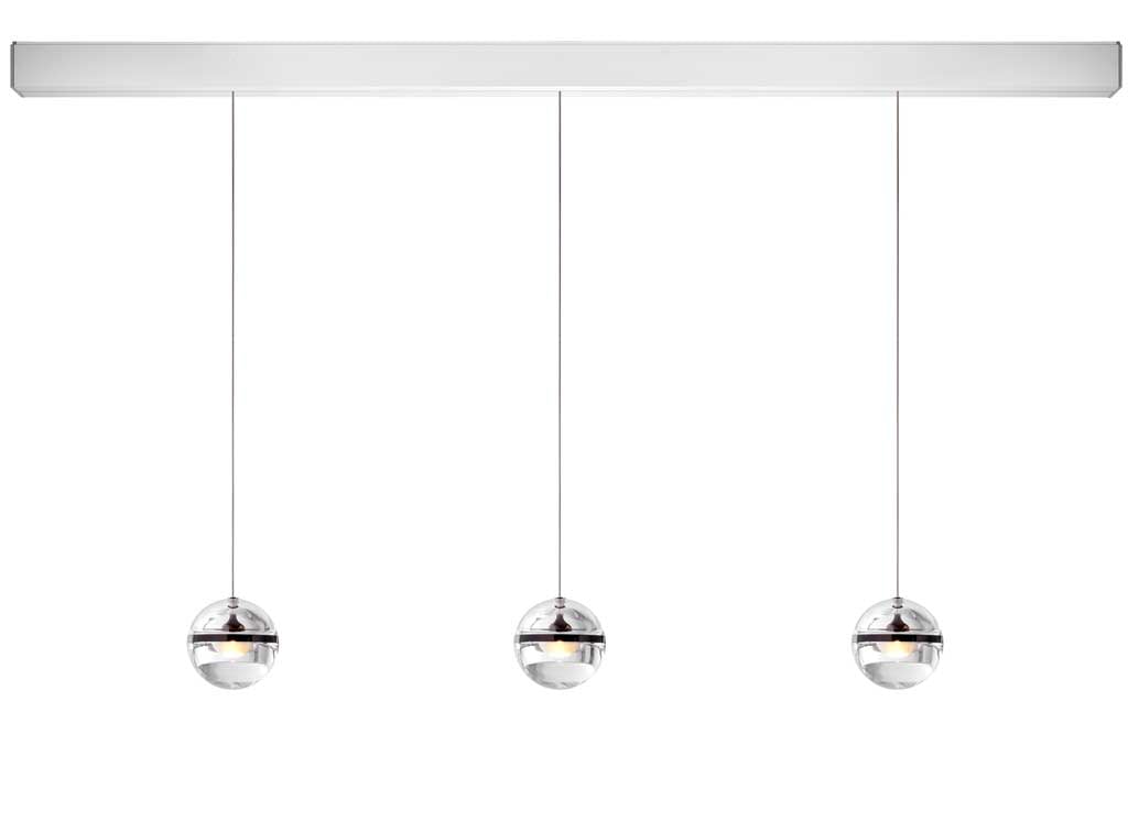 Die gläsernen Kugeln der Lumina Limbus Linear 3 Pendelleuchte bestehen aus mehrschichtigem Glas, das in einem aufwendigen Verfahren gepresst und geschliffen wird. Dadurch entsteht eine einzigartige Lichtbrechung, die gleichmäßig und blendfrei in den Raum strahlt und dennoch durch die Transparenz für optische Leichtigkeit im Raum sorgt. In der Mitte der Kugeln befindet sich jeweils ein schmaler Streifen aus eloxiertem Aluminium, in den die Lichttechnik sowie ein Kühlkörper verbaut ist. Dieser schützt die LED-Module der Lumina Limbus Linear 3 Schiene vor Überhitzung. Dies sorgt für eine harmonische Gesamtoptik und ermöglicht eine stilvolle Integration der Leuchte in unterschiedliche Raumkonzepte.