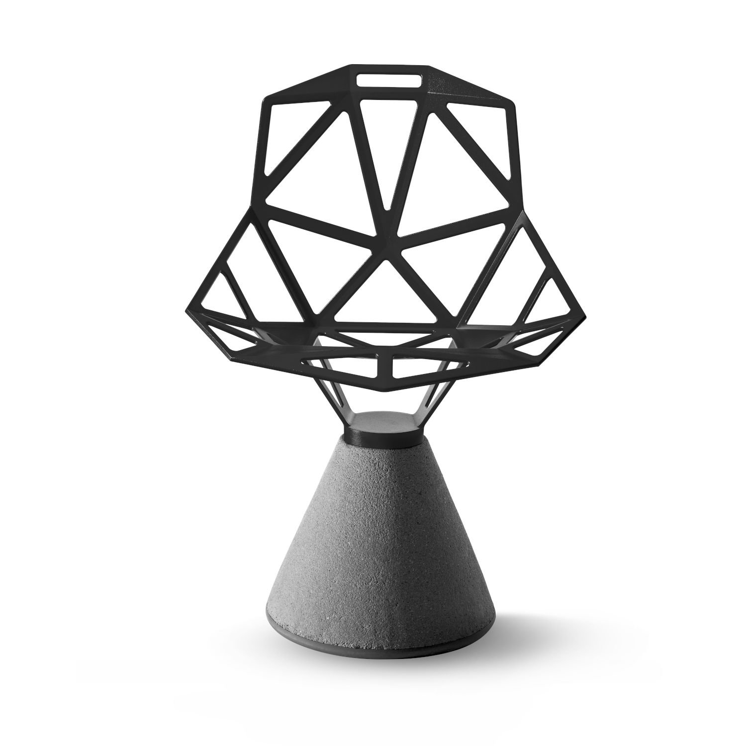 Der konisch zulaufende Sockel des Magis Chair One Stuhl Beton besteht in einem Guss aus wahlweise aus farblos imprägniertem oder schwarz gefärbtem Beton. Die Basis ist als fest verbaute oder drehbare Ausführung erhältlich. Die fein geometrisch konzipierte Sitzfläche wird aus Aluminium-Druckguss gefertigt und mit fluoriertem Titan und einer Polyester-Lackierung versehen, wodurch der Stuhl sich sowohl für den Einsatz im Innen- als auch im Außenbereich eignet.
