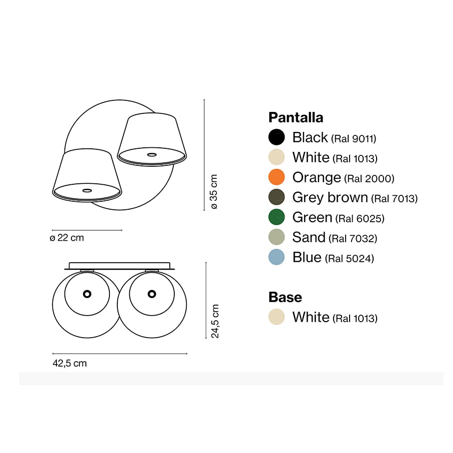 Die Wandhalterung der Marset Tam Tam A2 Wandleuchte besteht immer aus perlweiß lackiertem Metall. Der Schirm ist an der Unterseite mit einem opalen Diffusor aus Methacrylat versehen und sorgt so für ein blendfreies, perfekt gestreutes Lichterlebnis. Die Leuchtenschirme der Marset Tam Tam A2 Wandleuchte lassen sich unabhängig voneinander um 360° drehen und macht die Leuchte so zu einer besonders flexiblen Lichtquelle.