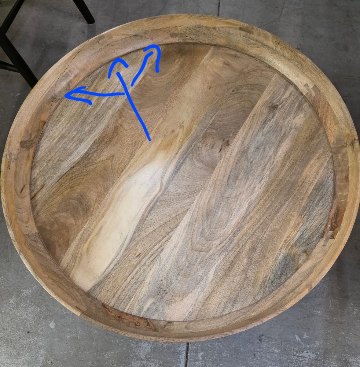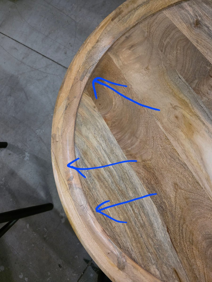 Der Mater Bowl Table Tisch wird aus Mangobaum hergestellt. Die Mangobäume werden angebaut und gepflegt, erst wenn Lebensdauer des Baumes vorbei ist, wird das alte Baum abgeholzt und das neue angepflanzt. Statt weiter den Baum zu verbrennen, wird er für Möbelprodukton angesetzt. Dabei sind gelbliche Farbtöne bei diesem Holz normal. Im Übrigen Mango als Frucht wird im ganzen Land konsumiert daher ist dieses Holz im Überfluss vorhanden. Es wird von Hand auf der Drehbank gedreht, so wird die Kunst des "kharaadi" oder Holzdreh Gesellschaft präsentiert und die lokalen Fähigkeiten unterstützt.