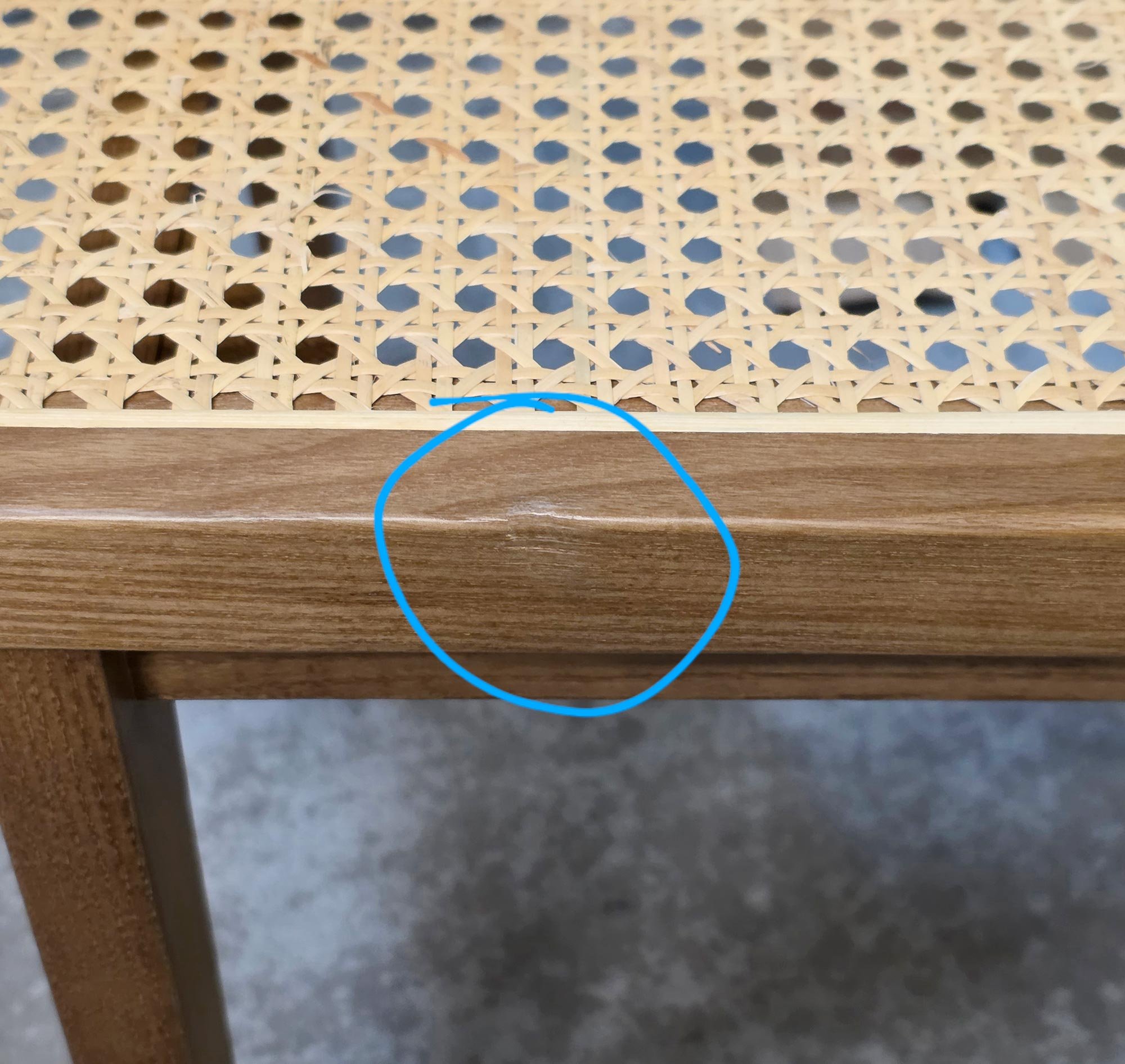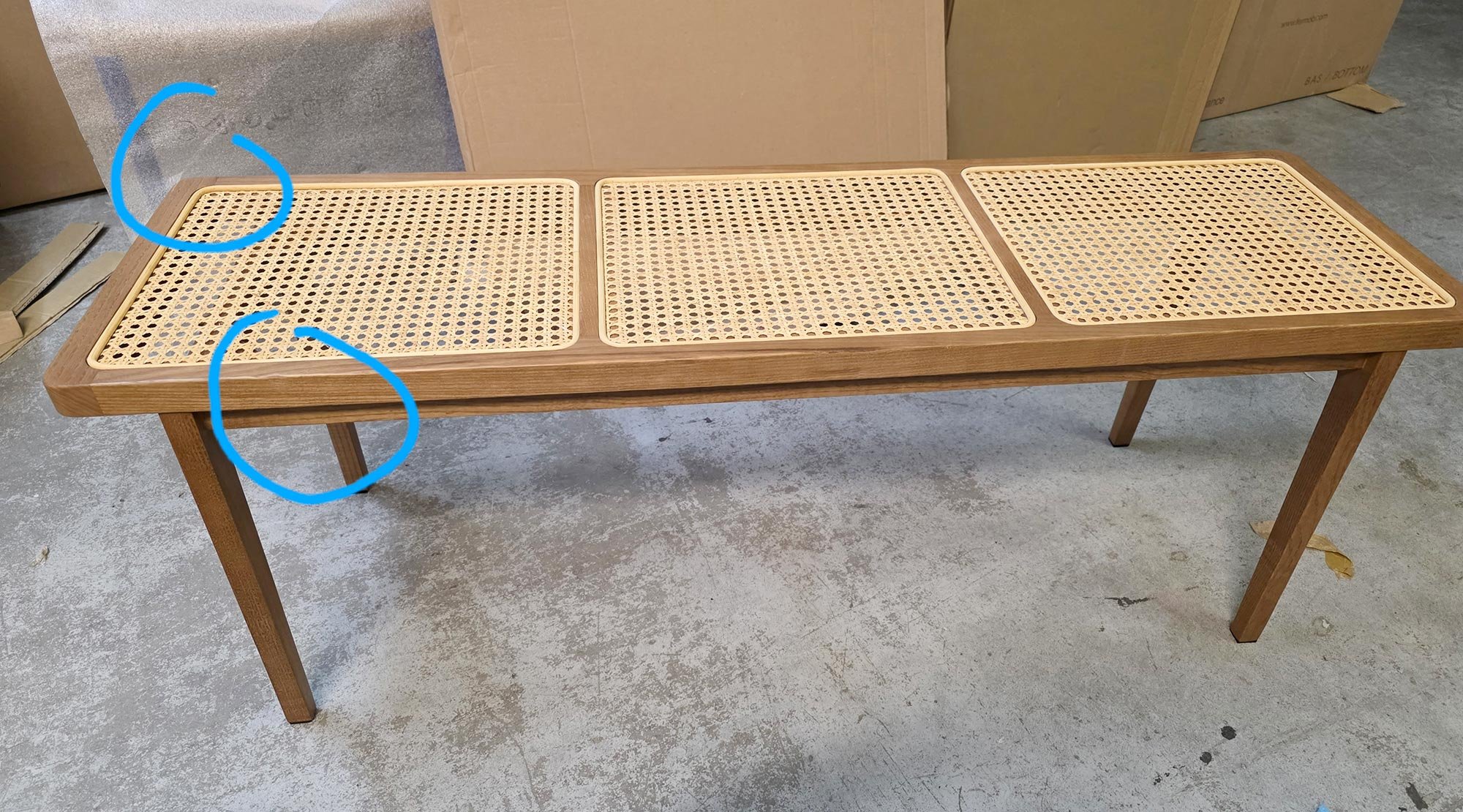 An der vorderen linken Seite ist die Bank leicht eingedrückt (optischer Makel, beeinflusst die Stabilität nicht - siehe Bilder)