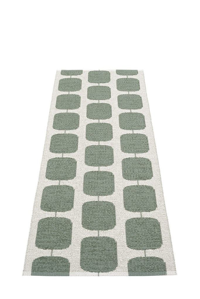 Mit seinen runden Formen und großem Muster hat das Retro-Design des pappelina Sten Outdoor-Teppich - army / fossil grey gute Voraussetzungen, ein neuer Pappelina- Klassiker zu werden. Das Design ist nach dem Muster benannt, das Steinen ähnelt, denn „Sten“ bedeutet Stein auf Schwedisch. Der Teppich besteht aus einer speziell angefertigten Kunststofffaser aus PVC, welche gewebt wird. Sie ist nicht nut weich, sondern macht ihn auch UV-beständig und wasserfest. An den Enden wird der weiche Kunststoff verschweißt und der Abschluss verstärkte, um die Lebensdauer des Läufers zu verlängern. Zur Authentifizierung befindet sich an diesem Rand das eingeprägte pappelina-Logo. Diese spezielle Kunstfaser ist gerade barfüßig besonders weich und angenehm,