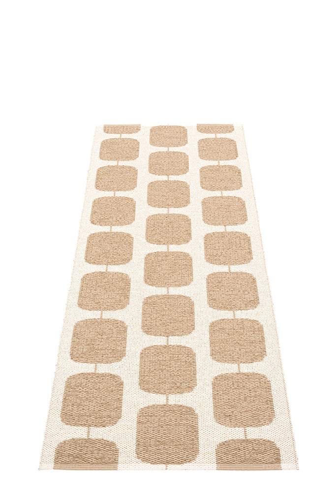 Mit seinen runden Formen und großem Muster hat das Retro-Design des pappelina Sten Outdoor-Teppich - light nougat / vanilla gute Voraussetzungen, ein neuer Pappelina- Klassiker zu werden. Das Design ist nach dem Muster benannt, das Steinen ähnelt, denn „Sten“ bedeutet Stein auf Schwedisch. Der Teppich besteht aus einer speziell angefertigten Kunststofffaser aus PVC, welche gewebt wird. Sie ist nicht nut weich, sondern macht ihn auch UV-beständig und wasserfest. An den Enden wird der weiche Kunststoff verschweißt und der Abschluss verstärkte, um die Lebensdauer des Läufers zu verlängern. Zur Authentifizierung befindet sich an diesem Rand das eingeprägte pappelina-Logo. Diese spezielle Kunstfaser ist gerade barfüßig besonders weich und angenehm,