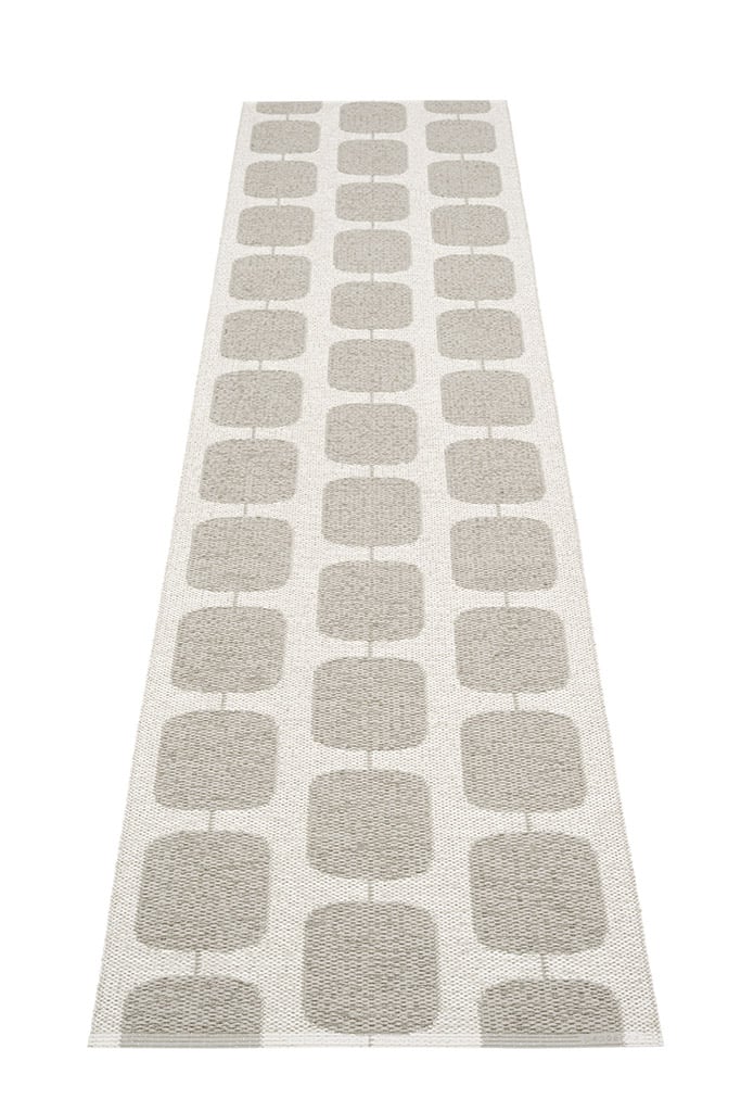 Mit seinen runden Formen und großem Muster hat das Retro-Design des pappelina Sten Outdoor-Teppich - warm grey / fossil grey gute Voraussetzungen, ein neuer Pappelina- Klassiker zu werden. Das Design ist nach dem Muster benannt, das Steinen ähnelt, denn „Sten“ bedeutet Stein auf Schwedisch. Der Teppich besteht aus einer speziell angefertigten Kunststofffaser aus PVC, welche gewebt wird. Sie ist nicht nut weich, sondern macht ihn auch UV-beständig und wasserfest. An den Enden wird der weiche Kunststoff verschweißt und der Abschluss verstärkte, um die Lebensdauer des Läufers zu verlängern. Zur Authentifizierung befindet sich an diesem Rand das eingeprägte pappelina-Logo. Diese spezielle Kunstfaser ist gerade barfüßig besonders weich und angenehm,