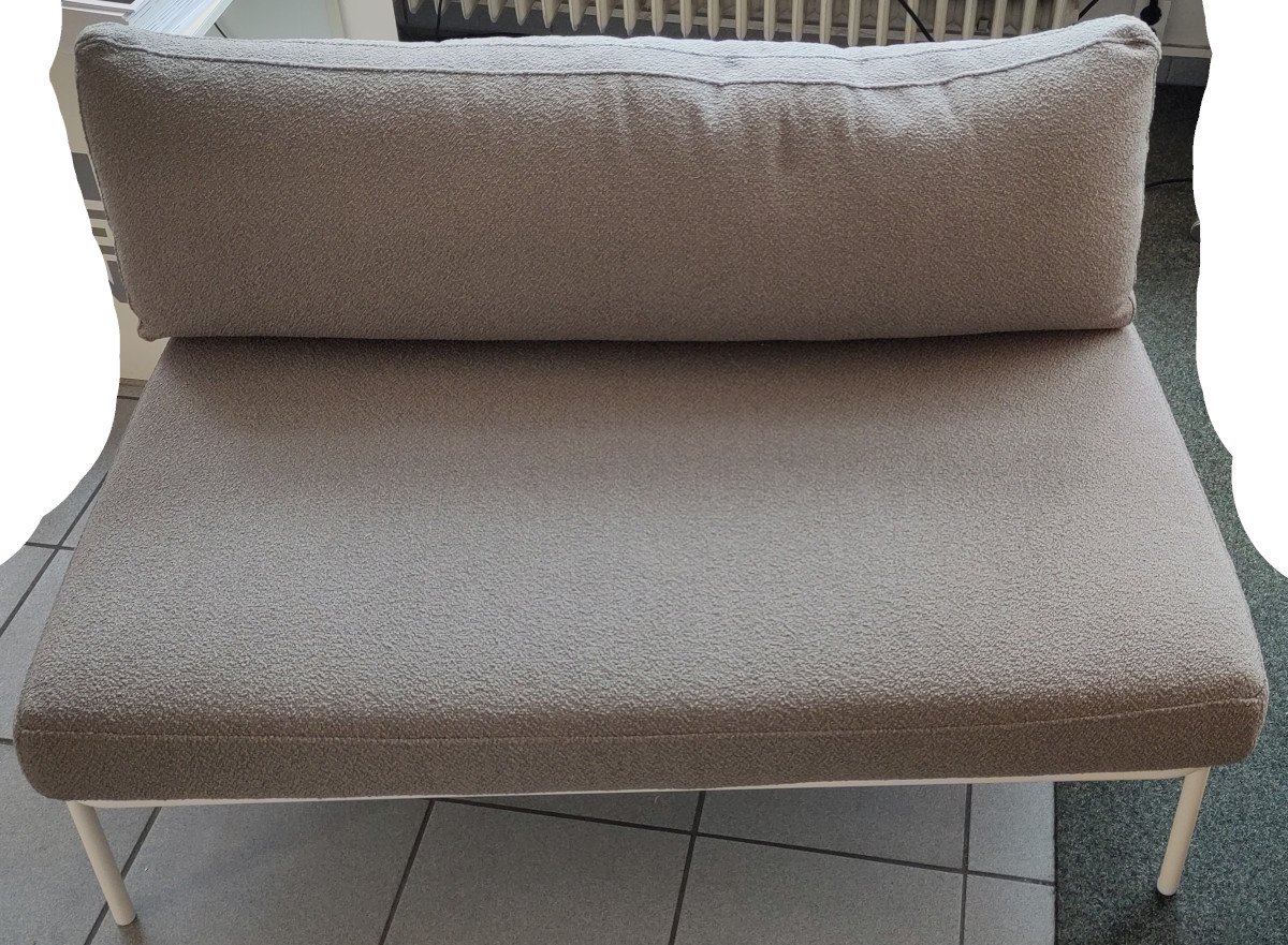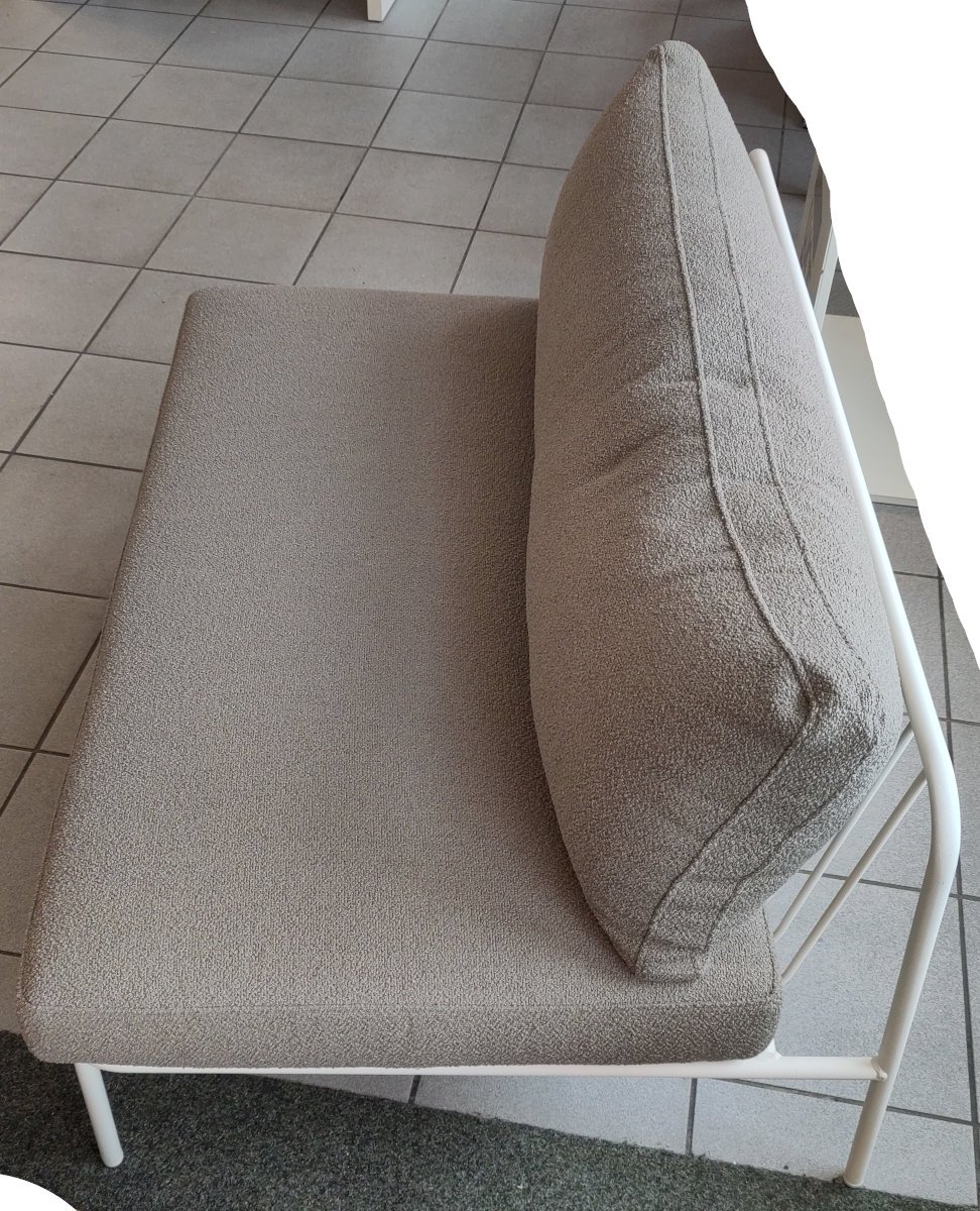 Die tragende Struktur des Pedrali Nolita Sofa DN001 Zentralmoduls besteht aus einem in verschiedenen Farben erhältlichen pulverlackierten Stahlrohr, welches eine Reihe von geschweißten Stäben enthält und damit Robustheit gewährt. Die großen Sitz- und Rückenkissen, die sich durch eine weiche, speziell für den Außenbereich entwickelte Polsterung auszeichnen, ruhen direkt auf der Stahlstruktur und bieten höchsten Sitzkomfort.
