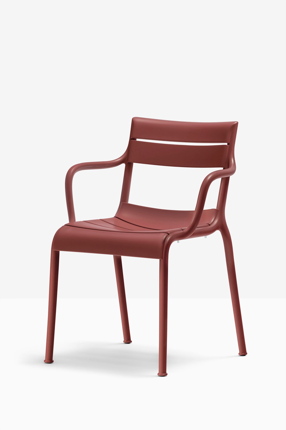 Der vom Designer Eugeni Quitllet entworfene und in Italien hergestellte Pedrali Souvenir 555R Armlehnstuhl besteht aus vollständig recycelten Polypropylen, jeweils zu fünzig Prozent aus privaten und zu fünfzig Prozent aus industriellen Abfällen von Kunststoffmaterial. Der stapelbare Armlehnstuhl ist speziell für die Verwendung im Außenbereich designt. Aufgrund seines minimalistischen Stils eignet er sich aber auch für den Innenbereich und fügt sich in jedes bestehende Interieur ideal ein. Die schwungvoll gestalteten Querstreben und Armlehnen sorgen für höchsten Sitzkomfort.