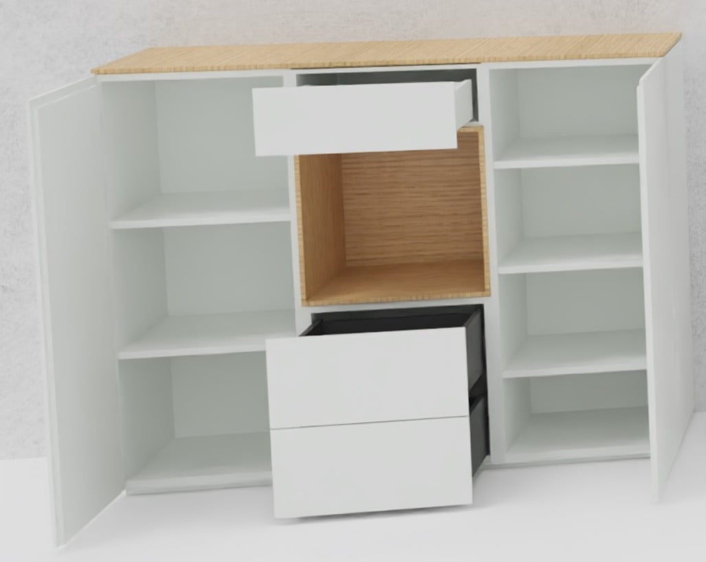 Das offene Element der COSMO-Serie ist somit ein cleveres Designdetail, das sowohl ästhetischen als auch praktischen Mehrwert bietet. Es ermöglicht unzählige Gestaltungsmöglichkeiten und trägt dazu bei, COSMO-Möbelstücke einzigartig und vielseitig einsetzbar zu machen.