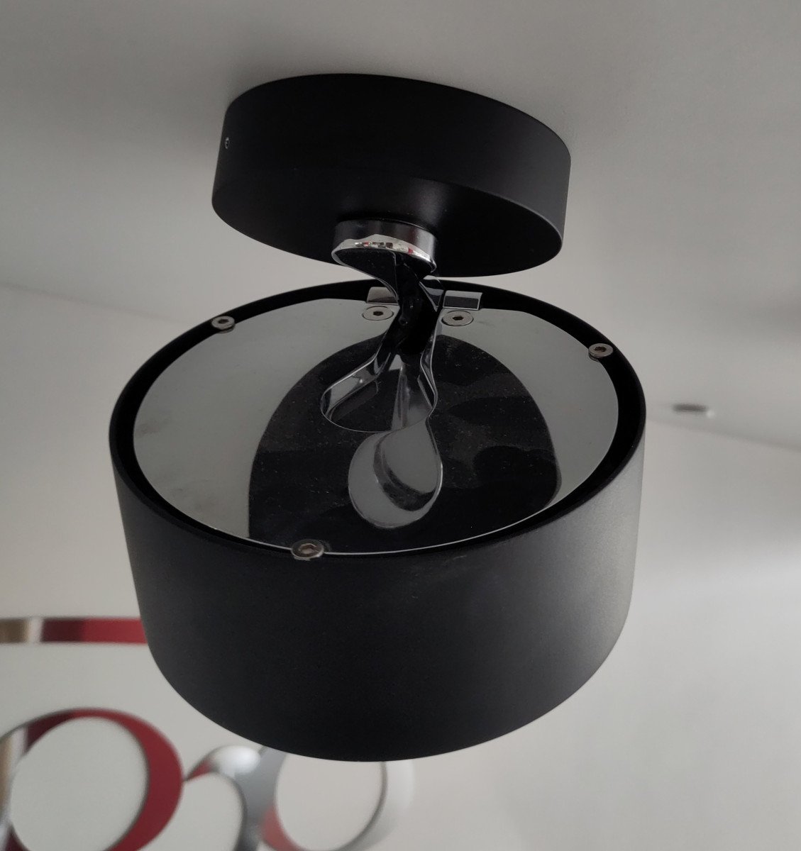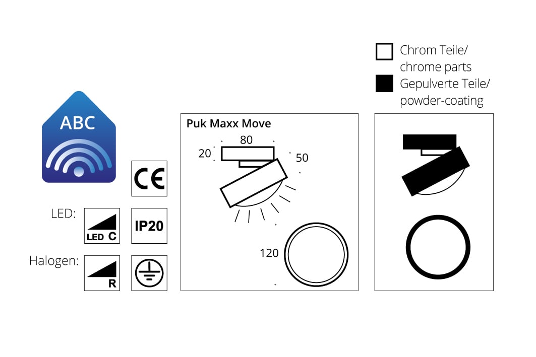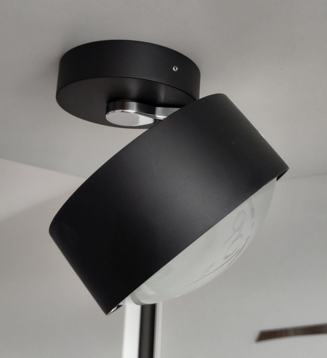 Die Top Light Puk Maxx Move Deckenleuchte besteht aus einem ringförmigen Gehäuse aus Metall. Dieses ist über ein Gelenk mit dem Baldachin verbunden und kann an diesem um 360° gedreht und im 50°-Winkel gekippt werden. So entstehen mit nur einer Leuchte vielfache Beleuchtungsmöglichkeiten. Die Top Light Puk Maxx Move Deckenleuchte ist wahlweise als Halogen- oder als warmweiß leuchtendes LED-Modell verfügbar. Sie kann über einen externen Dimmer in ihrer Lichtintensität variiert werden.
